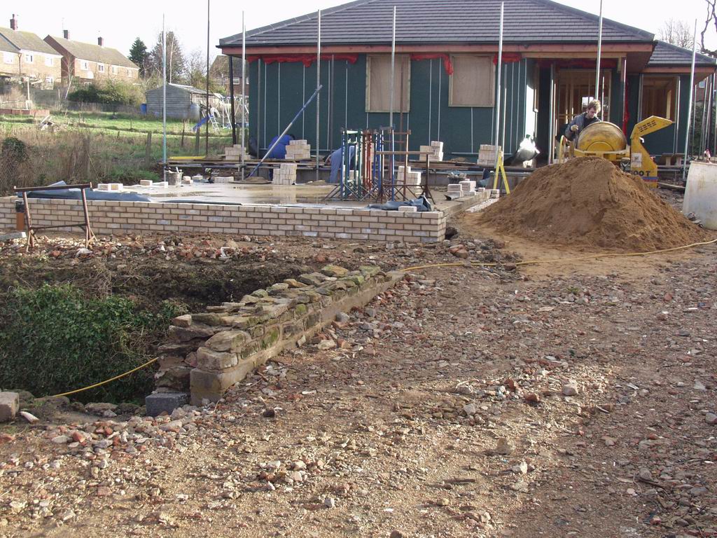 As the bricklaying progressed to the rear of the bungalow we realised that the line of the plinth was too high to fit under the garden-room window ledge. A quick decision was made to step the plinth down at this point. Most folk who look at the bungalow either don't notice, or if they do, think it is a deliberate design feature!
