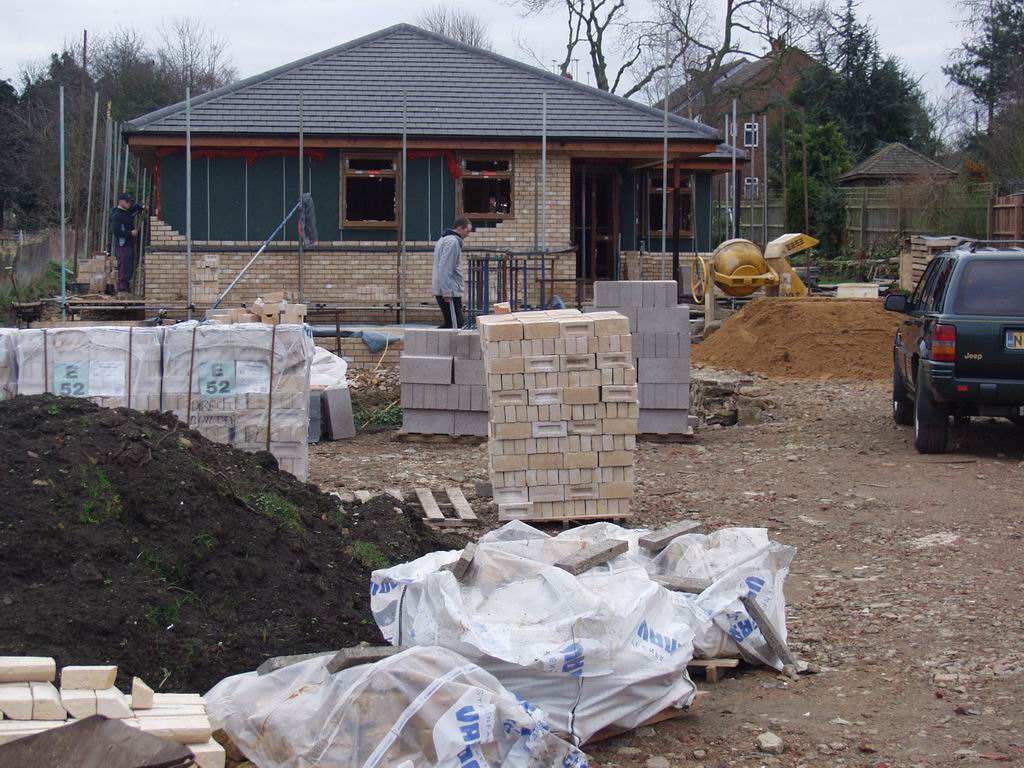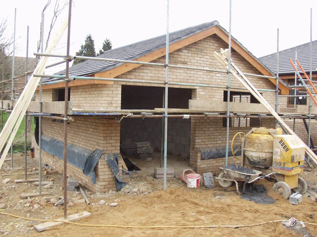After a long "Christmas break", on 19th January the bricklayers began work in earnest, starting with the garage. The brickwork on the garage is structural, whereas on the bungalow it is not - it forms a weather protection barrier, but is otherwise largely "cosmetic".