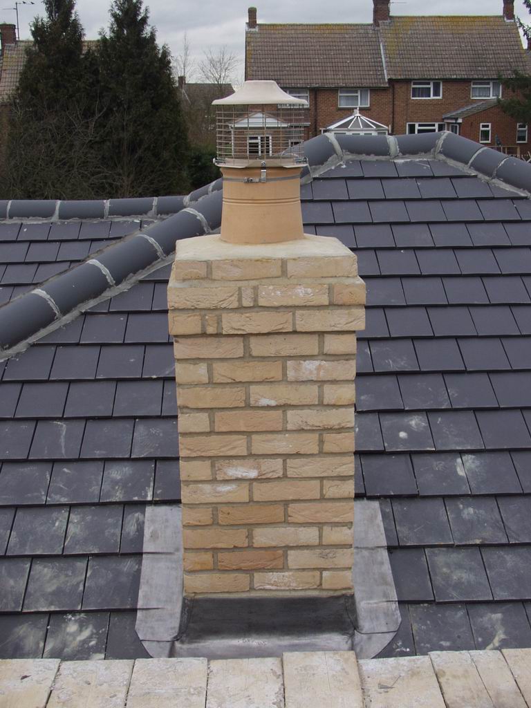 The same bricklaying team built the stone fireplace and then the chimney. We chose a local stone - "Pitsford cropped" - supplied by Bennies. Steve made a major contribution ...... fitting the cowl to the top of the chimney pot!