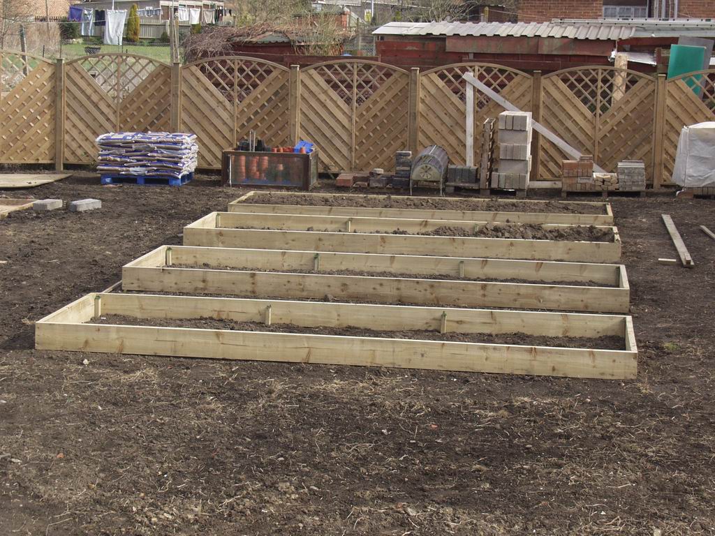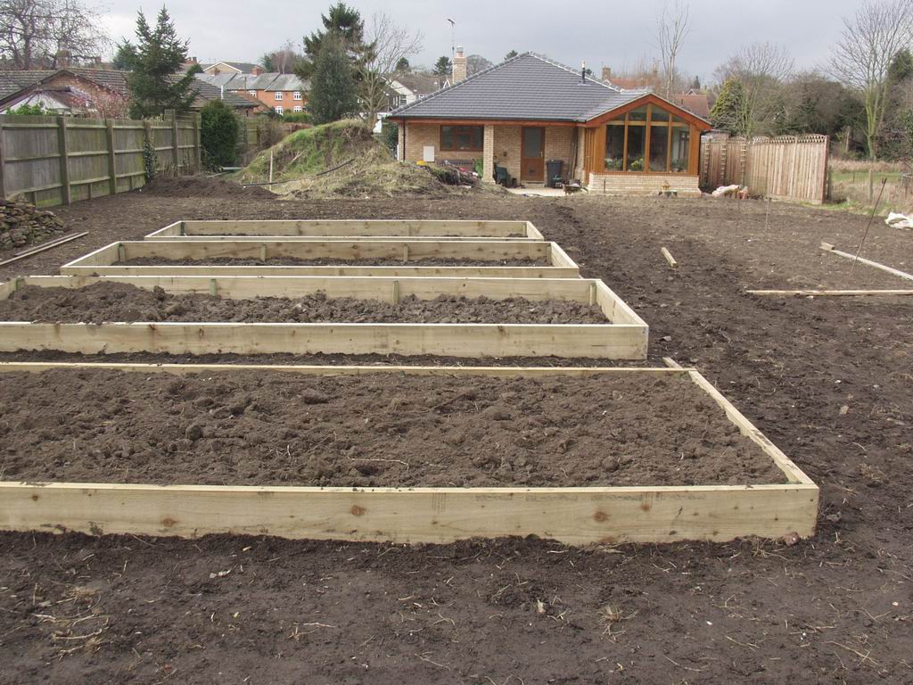 We planned the top half of the plot to be vegetable and fruit garden and constructed these 4 raised beds. Despite best intentions to leave them fallow for the year and deal with any weeds which came through, we ended up growing potatoes, beans, corgettes and chrysanthemums.