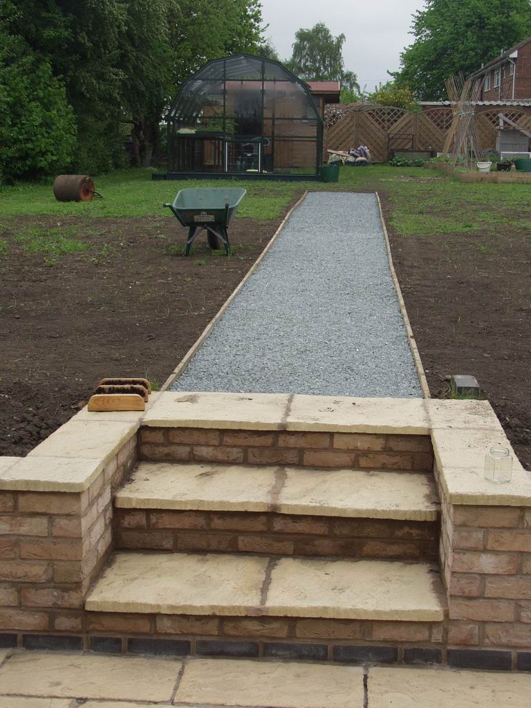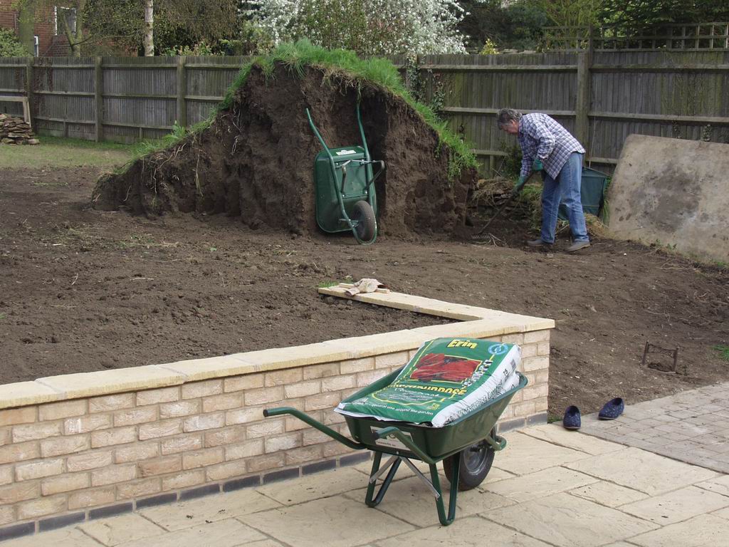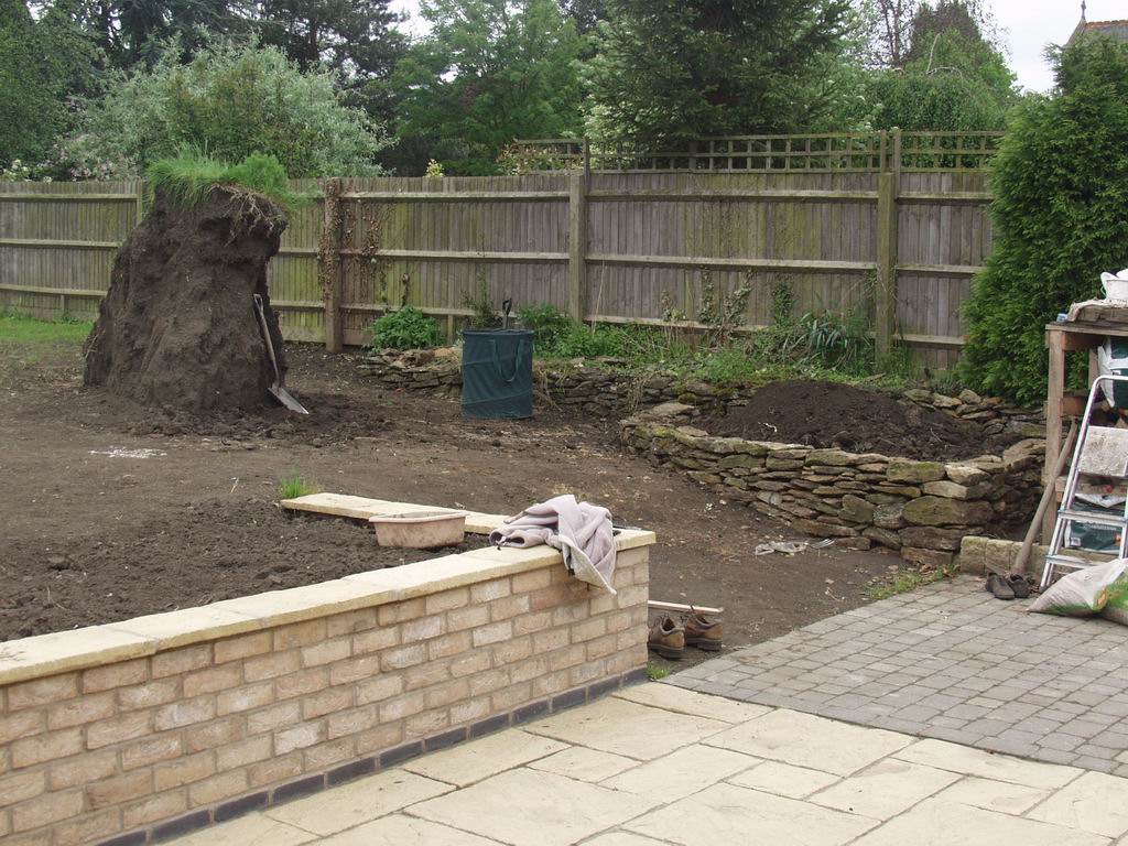 The heap of topsoil was gradually spread over the garden, levelling up to the top of the retaining wall. Steve did a bit each day, gradually nibbling away at the pile. Then one day when his back was turned it toppled over, denying him the pleasure of knocking the final column down himself!