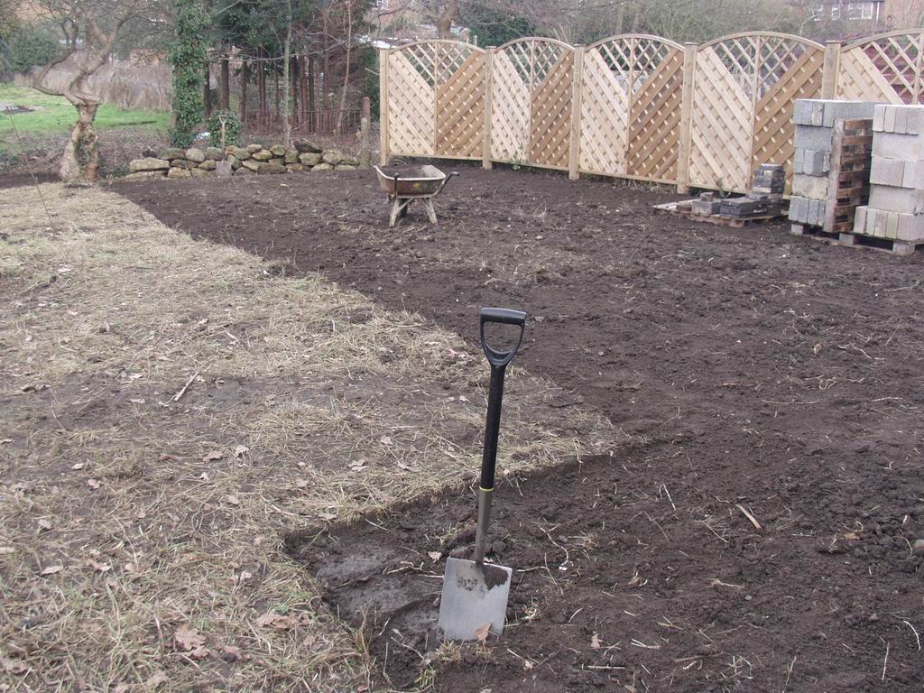 Once we had skimmed the surface of the weeds we dug the ground over and began to spread soil to get it approximately level. Steve eventually managed to get our old rotovator going and that made the process a bit easier.