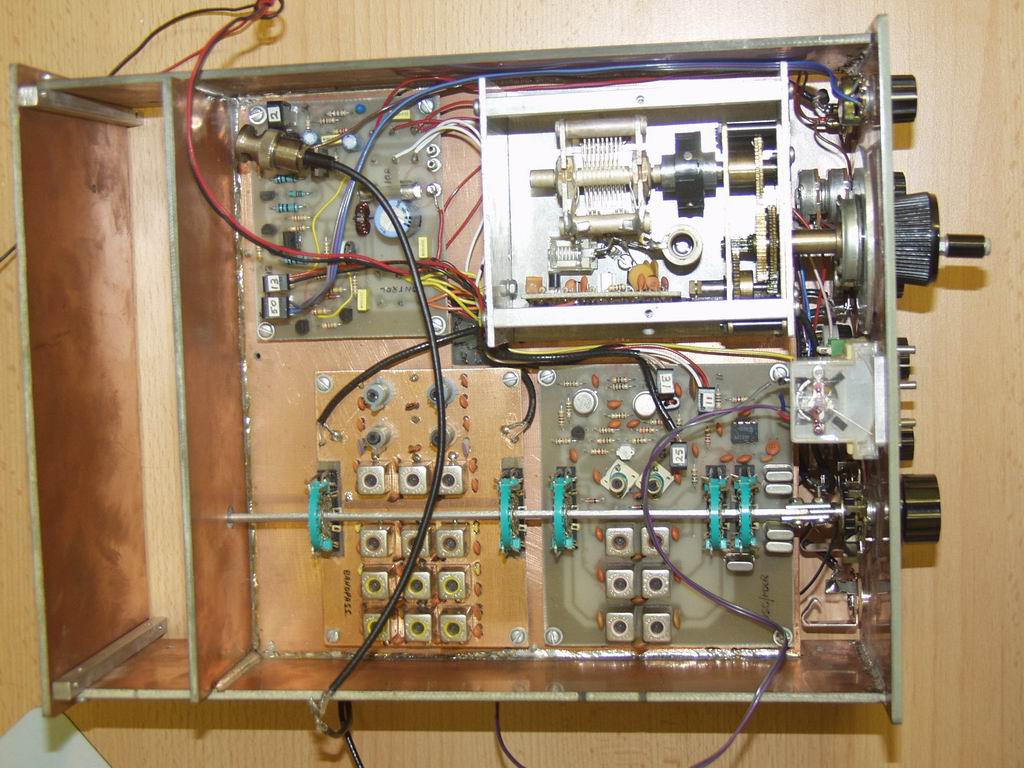 Some years ago I owned a Ten-Tec Argosy - the analogue MkI version. I regretted selling it and decided to build my own "improved" version. It is not yet complete - the PA and output low pass filters have still to be installed in the rear screened compartment. The circuitry is exactly the same as the Argosy MkII with the exception that mine retains the analogue frequency readout. Take a look at the photos - I'm particularly pleased with the feel of the VFO slow-motion drive; it's silky smooth with no backlash at all. I picked the gearbox up at a local Ham boot sale for a few pence!