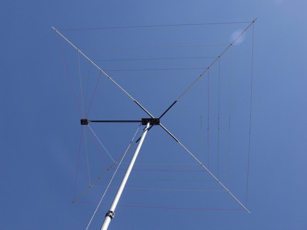 During recent range testing of a hexbeam I needed a horizontally-polarised resonant antenna covering 20m thru 10m which could be assembled and disassembled quickly and easily. The cobweb antenna meets the requirement nicely - it comprises 5 parallel dipoles bent into a square shape and mounted on a support structure made of fibreglass poles. The turn radius is a very compact 6.25ft. Computer modelling of this arrangement shows that one result of bending the dipoles is that the antenna is close to being omnidirectional in azimuth, with a Free Space eccentricity of about 4dB; a less attractive result is that the feedpoint impedance drops to around 12 ohms at resonance.