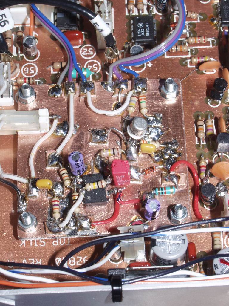 Just 2 changes are made to the Omni board, both of which can be made without removing the board. Firstly, one end of R22 (330K) needs to be cut to open-circuit the resistor; if this is done carefully it will be possible to reverse the modification, if ever required, by re-soldering the resistor lead. Secondly, a 12.5v supply connection needs to be made to the new board; I tack soldered a lead onto the 12.5v end of R52 (3R3). Don't do this with the power on! All the other connections required are made using the existing flying leads and board connectors.