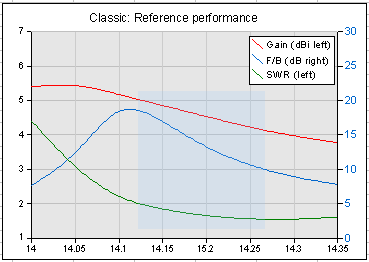 The chart on the right shows the modelled performance of a full-size 2-element 20m monoband yagi in Free Space; it makes a useful reference for judging the performance of the Classic hexbeam.