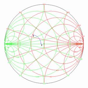 Earlier on this page we learned that the Driver of the Hexbeam could be shortened or lengthened considerably without compromising the performance of the antenna. Shortening the Driver caused an increasingly capacitive component at the feedpoint; we noted that for a Reflector / Driver ratio of 1.04 the impedance was about [25 - j25] Ohms which makes it a prime candidate for Beta matching. This impedance is plotted as Point 1 on the Smith Chart to the right.