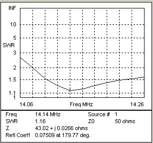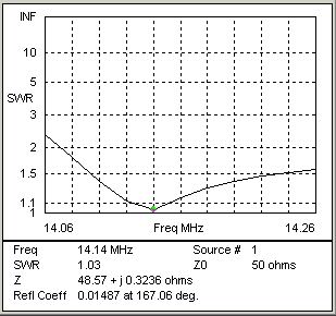 If we now model the shortened Driver with the parallel inductor we can see the effect on SWR across the frequency range of interest in the second chart. The SWR has been improved to below 2:1 in all but the bottom 10KHz of the range. Small adjustments to the inductor would likely improve the SWR at 14.140 MHz to below 2:1 at the cost of some small increase to the SWR at 14.260 MHz.
