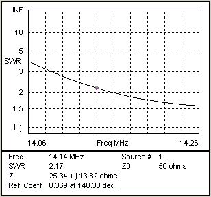 If we now introduce this series transmission line section into our model we can see its effect on SWR across the frequency range of interest in the second chart. The SWR has been improved to below 2:1 in all but the bottom 20KHz of the range. The SWR at 14.060 MHz could probably be reduced to below 2:1, at the cost of a small increase at 14.260 MHz, by small adjustments to the length of the series matching section.