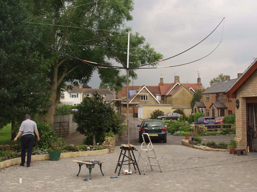 Preliminary tests were carried out on the 20m elements before the other band wires were added. The antenna is about 12ft above ground on a very temporary support. The XYL seems much more interested in the gardening than in the new antenna!