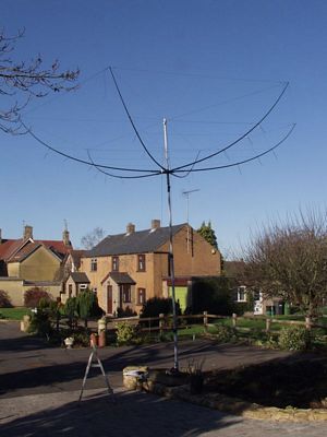 This is the antenna up at about 12ft for some early SWR measurements. Notice that some of the cable ties have still to be trimmed neatly.