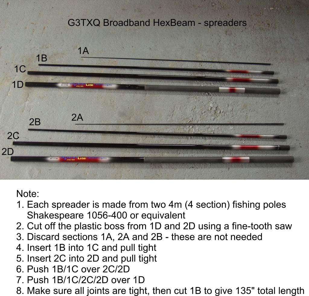 Photo of the two 4m fishing poles I used for each spreader, with instructions on how to assemble them. I found that the use of two 4m poles resulted in a better shape than using a 5m pole.
