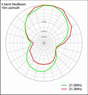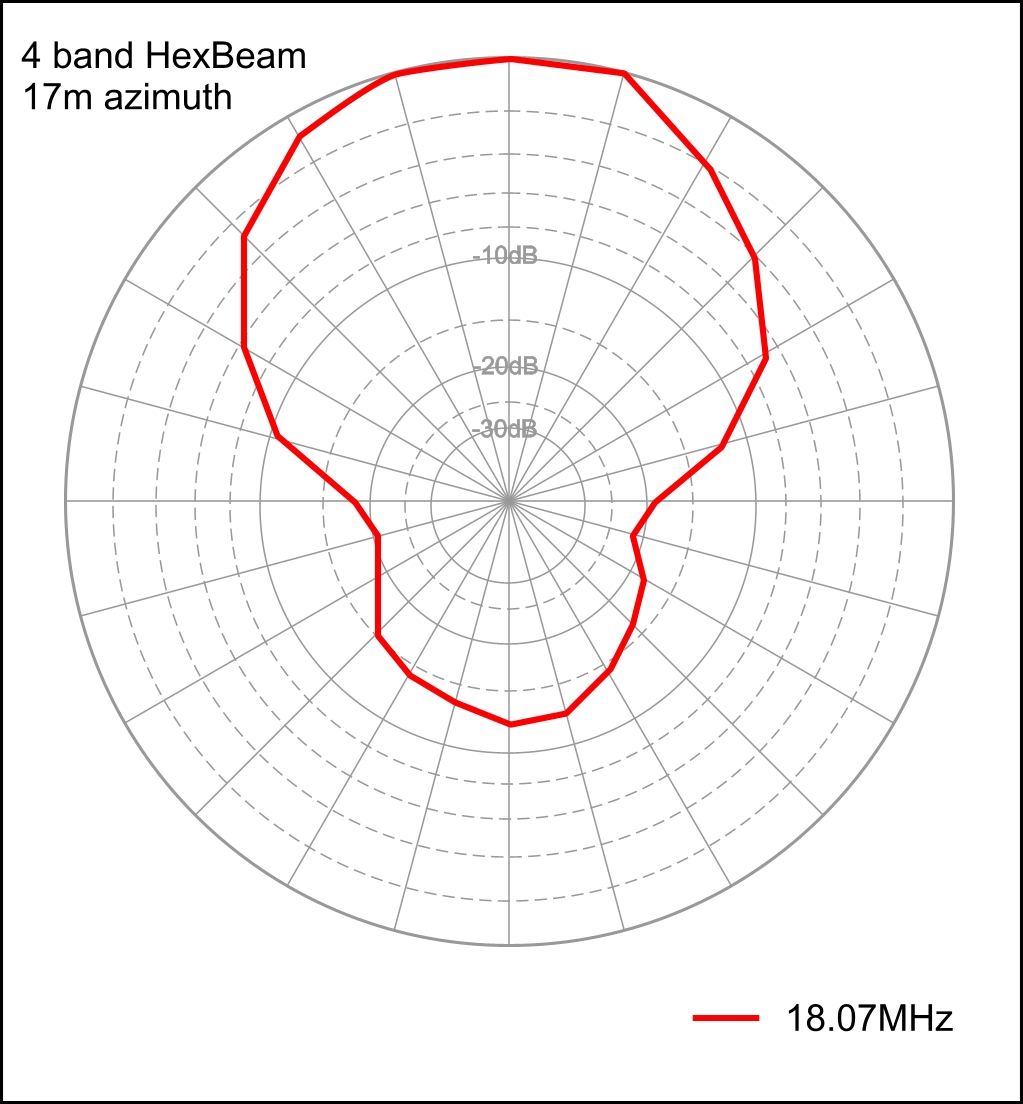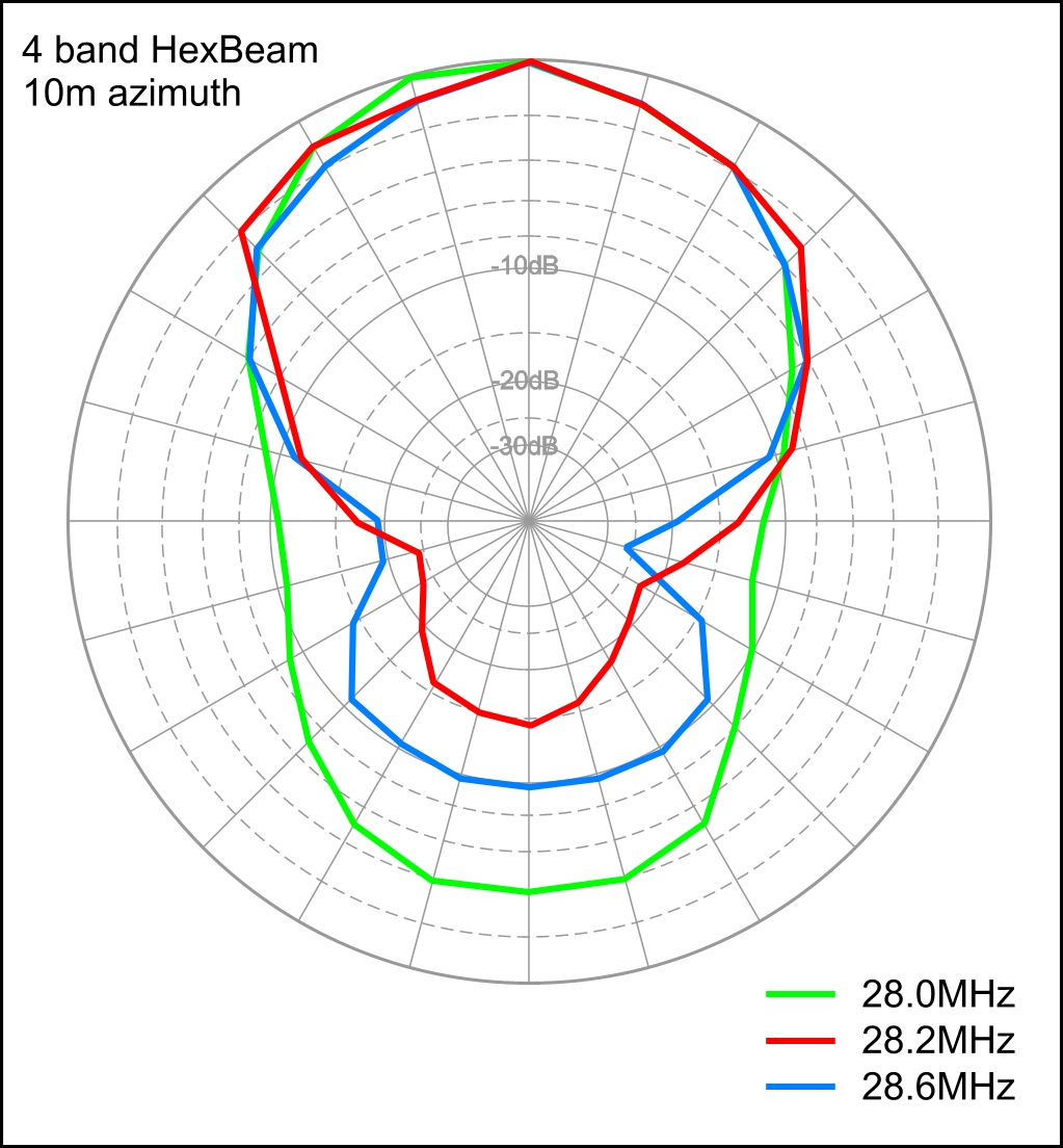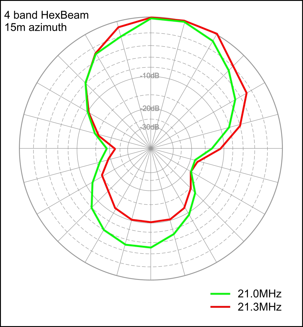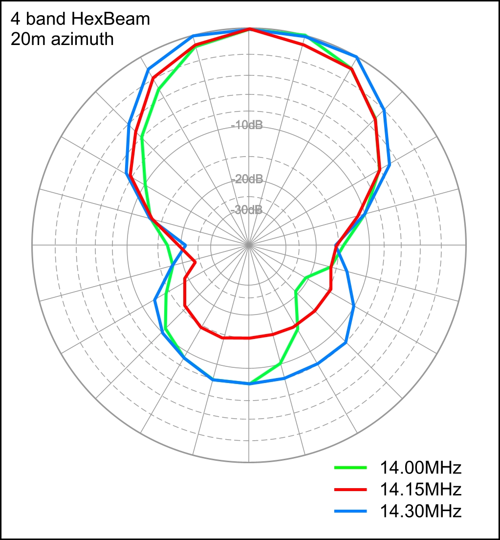 The F/B curve and the two azimuth plots show much less sign of a dramatic fall-off in F/B at lower frequencies; the F/B performance also seems to be several dB inferior to 10m although we have to remember that the height above ground (expressed in wavelengths) is quite different for the two bands.