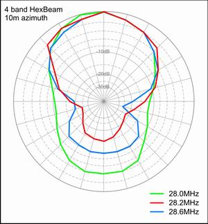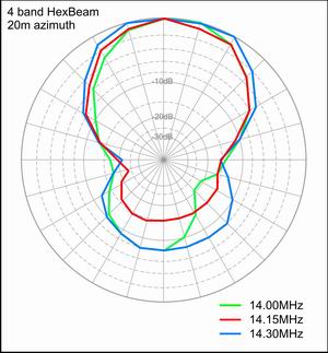 This page presents a series of SWR measurements and azimuth plots made on my Mk2 4-band Classic Hexbeam which covers 20/17/15/10 meters. I did not have a reference antenna and so could not check Forward Gain. The measurements were taken with the beam baseplate about 20ft above ground level and with half the beam overhanging a 14ft garage roof.
