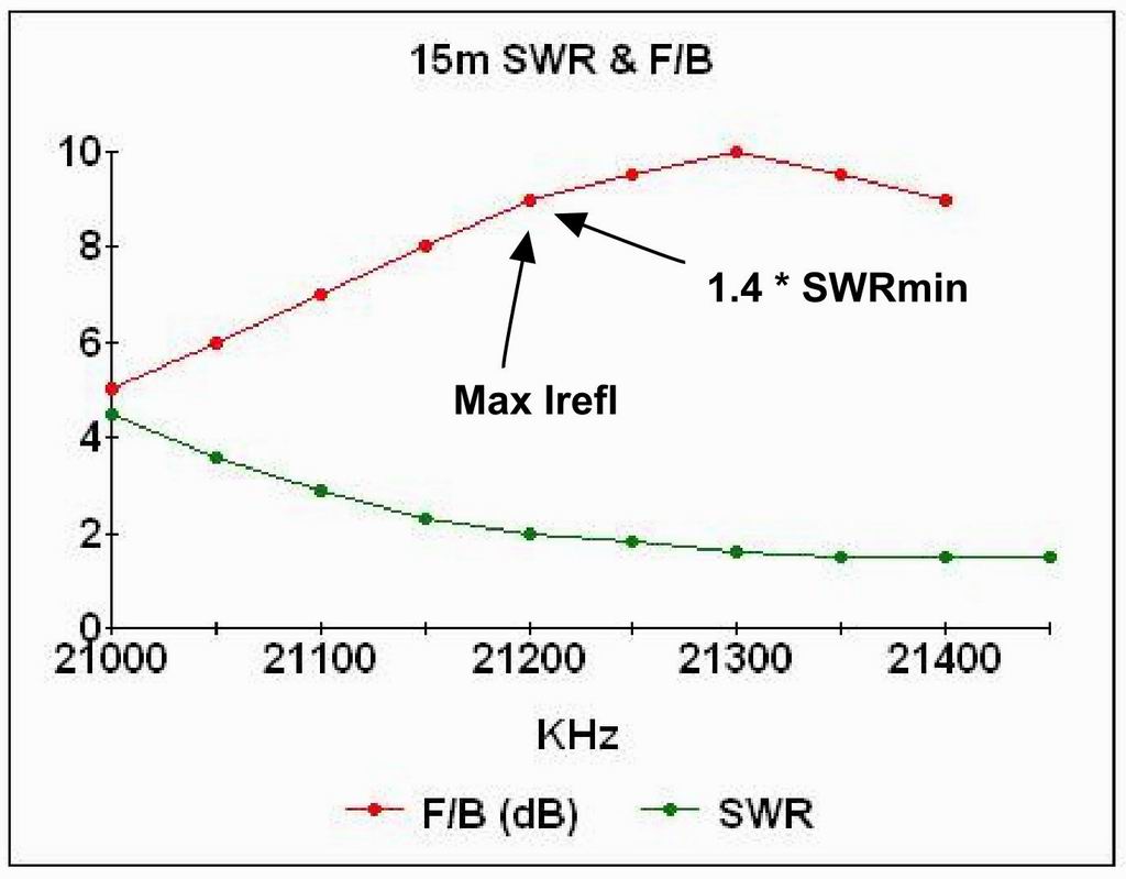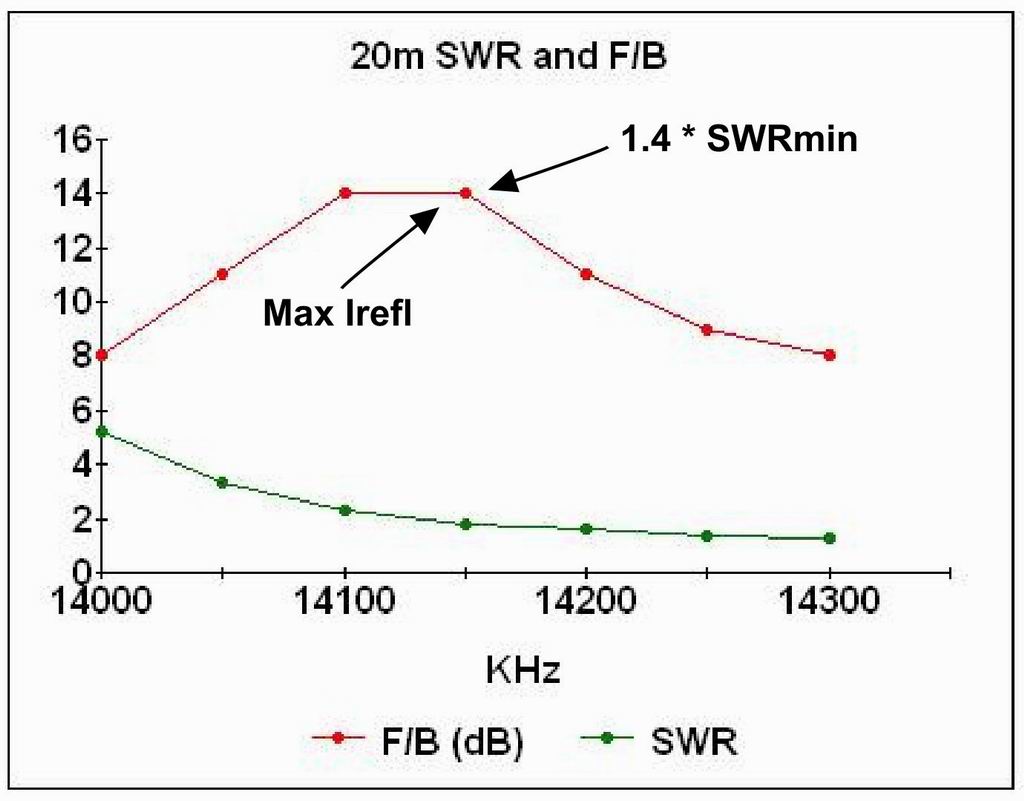 Also plotted on the chart are the frequencies of best beam performance predicted by two tuning methods - maximum Reflector current and "SWR = 1.4 * SWRminimum. Both predictions are slightly low in frequency, but would give acceptable results for most practical purposes.