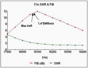 The 17m SWR and F/B charts are again "classics"; the F/B curve peaks at 12dB and is skewed, whilst the SWR rises steeply below the frequency of best F/B. The two tuning methods predict the frequency of best F/B to an accuracy of 30KHz. The amateur band is quite narrow in percentage terms, and so it was necessary to extend the measurements well outside the band in order to see the characteristic shapes.