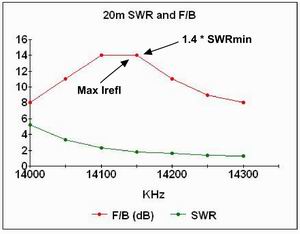 On 20m the F/B peaks at about 14dB between 14100 KHz and 14150 KHz. The F/B curve shows evidence of faster degradation at lower frequencies but it is not as pronounced as on 10m or 17m. The bandwidth over which the F/B exceeds 10dB is 200 KHz.