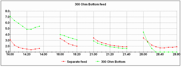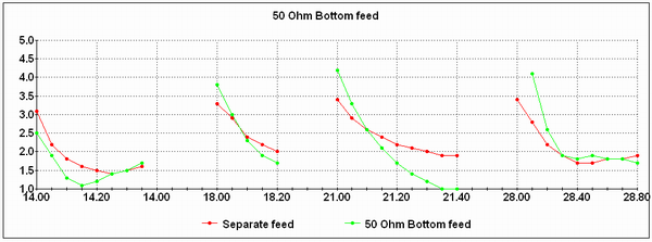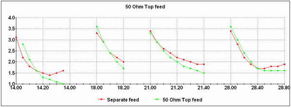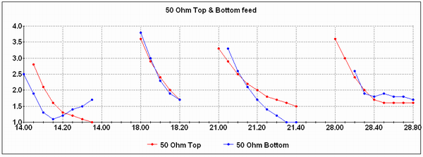 Because the 50 Ohm Top and Bottom feed results are so similar, I have plotted them on the same chart, below, so that a direct comparison between the two can be made: