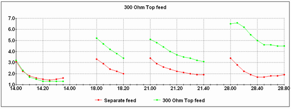 On 20m, 17m and 15m the presence of the interconnecting coax has again generally produced an improvement in SWR. There is some minor degradation of the 10m performance, however this feed arrangement appears to deliver quite acceptable performance and is little different from the 50 Ohm Top fed case.