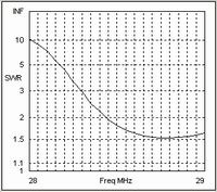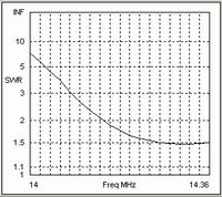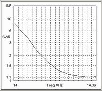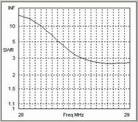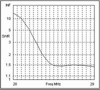 If we now change the interconnecting cable to one with a higher characteristic impedance of 300 Ohms we get the SWR curve shown in the third chart. Again there has been a noticeable improvement in the SWR at the higher end of the band. The lower value of shunt capacitance, resulting from the increased characteristic impedance and the higher velocity factor, provides a slightly better overall match than the 50 Ohm case.