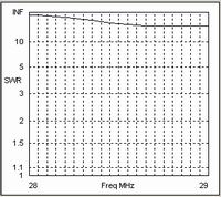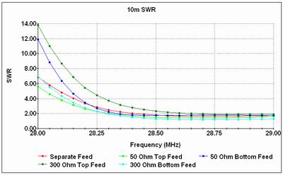 We will now move the feedpoint to the top of the array and revert to 50 Ohm cable for the band interconnections. Again we get an SWR curve which is indistinguishable from the reference curve because we are simply connecting to the 10m Driver through an extra 30" length of 50 Ohm cable, which will have no effect on the SWR.