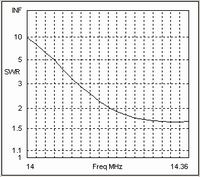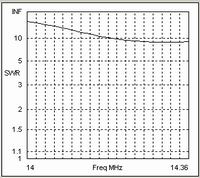 All is not lost however! Note that the high Zo interconnection has introduce a large inductive reactance but has hardly changed the resistive component. We have seen in the earlier "Matching" section that, within limits, we can make the Driver capacitive by shortening it without detriment to beam performance. If we make the Driver 9% shorter than the Reflector we can almost totally compensate for the inductance introduced by the 300 Ohm interconnection. We then get the SWR performance shown in the sixth chart which is quite acceptable.