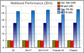 Shown below are performance data charts for a 5 band (20m thru 10m) multiband Broadband Hexbeam and a Classic Hexbeam. On each chart the extreme left hand data is the monoband performance; the data to the right then shows progressively how the performance changes as further band elements are added to the structure.
