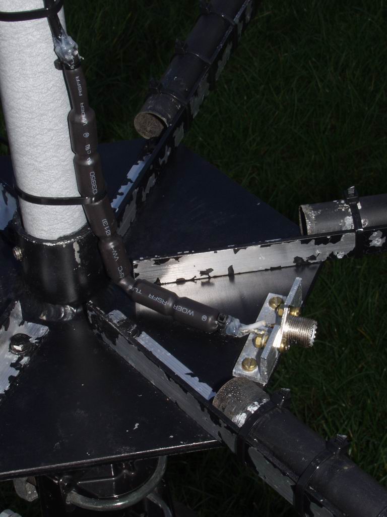 Now we're ready to interconnect the Drivers with 50 Ohm coax, and connect the feedline to the top Driver. I mounted a SO239 socket on the baseplate so that the antenna could be made an independent entity. I also put a ferrite choke balun close to the socket. Be sure to use plenty of water-proofing compound around the exposed ends of the coax. Annoyingly, the black paint is flaking off the aluminium angle although it's OK on the baseplate :(