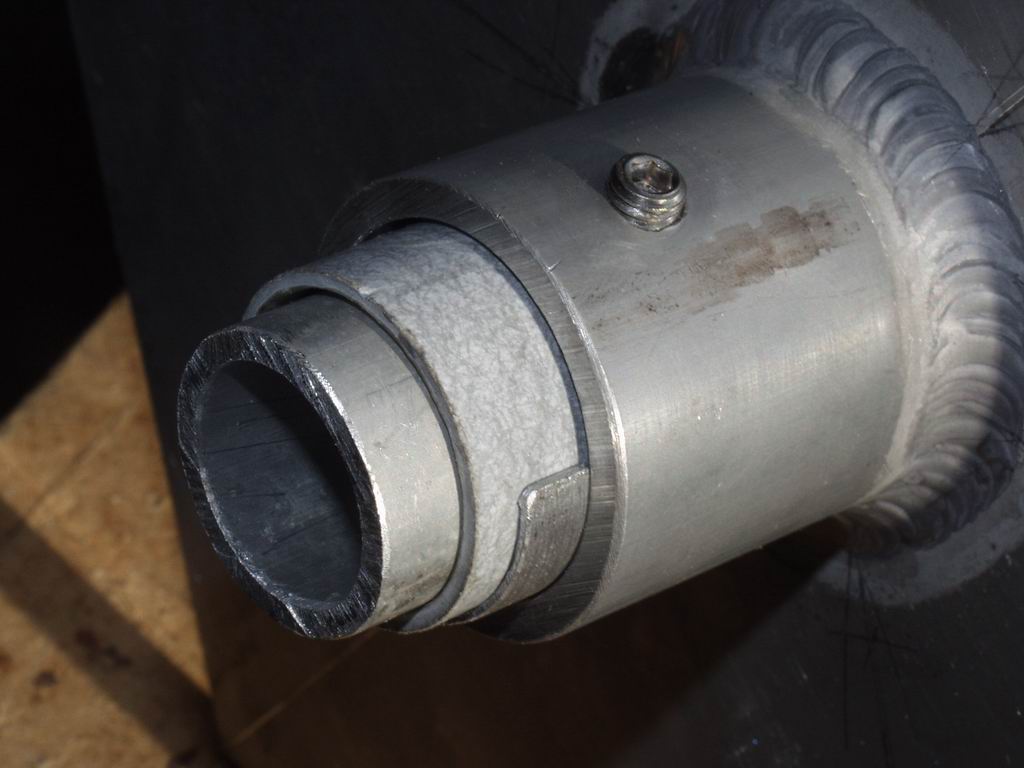The picture on the right shows the cross-section detail of how I fixed the centre post inside the baseplate tube. A 1/3" hexagon head grub screw passes through a threaded hole in the tube, through a clearance hole in the fibreglass centre post, and presses onto an aluminium insert inside the post. There is also a thin shim to make up the difference between the ID of the baseplate tube and the OD of the centre post. This arrangement feels so strong I believe you could extend the centre post and mount a small VHF/UHF antenna on it.