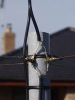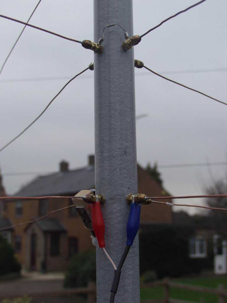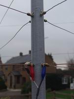Here's the array in the air on a temporary mast ready for tuning. The excess "tail" on the tie wraps has not yet been cut off in case final adjustments are needed. The middle photo shows a Driver being energized via crocodile clips, while the current in the Reflector is being monitored with a clip-on probe which you can just see behind the red clip. You can also see that the unused Driver is terminated with a 47 Ohm resistor. The right hand photo shows the advantage of terminating the two halves of the Reflector separately - if you trim the wires too short you can recover the situation with a slightly longer link.