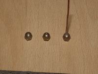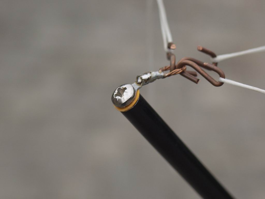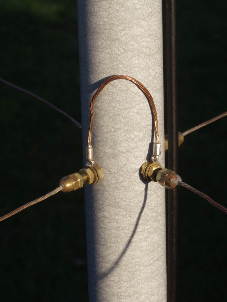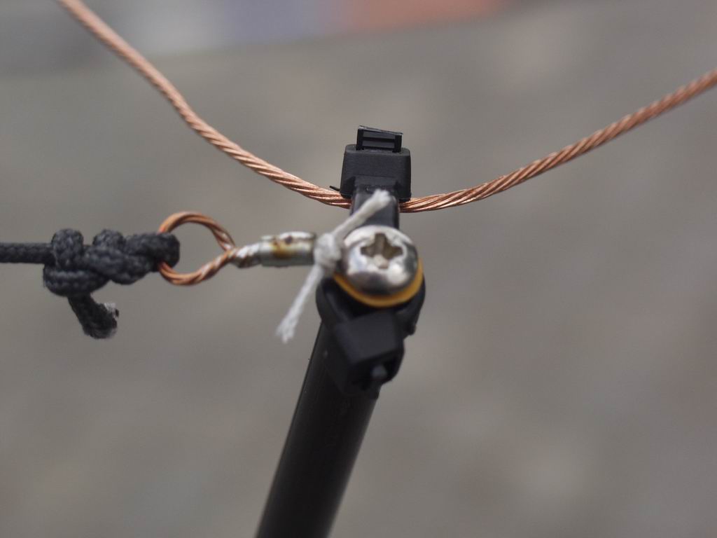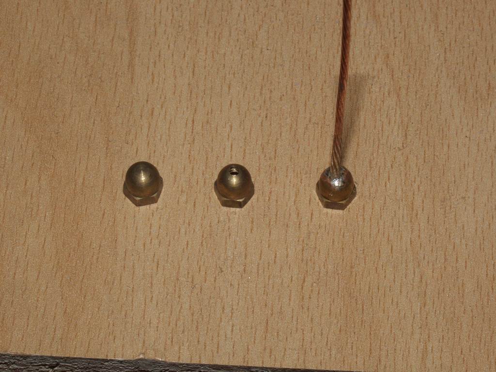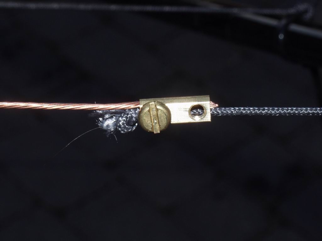 I used 16 gauge 7-strand copper wire - its tough enough to withstand the tension of the spreaders, but not so heavy that the wires sag. To provide a fixing at the centre post I drilled a hole in a 1/6" brass "dome nut" and soldered it onto the wire. At the outer end I fixed the wire to the insulating cords using brass terminal blocks and brass screws; I used 2 screws in the terminal blocks for the top wires because they need to withstand the tension of the spreaders. The right hand picture shows one of the wires cut to length and ready for loading on the support structure; you'll need 4 of these for each band. Be sure to label them with the band, and whether they are Driver or Reflector - it's very easy to get them muddled up!