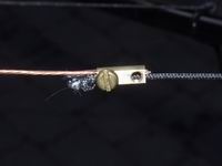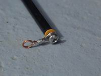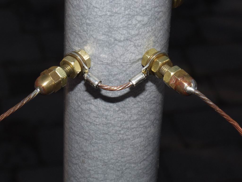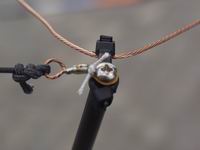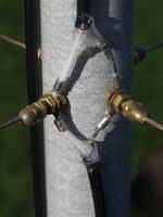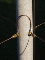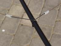 These photos show how the wires are held onto the support structure; I typically use 2 tie wraps - one to form a loop, and the other to tie the loop onto the spreader. I put a couple of turns of insulating tape around the spreader to prevent the loop slipping inwards. The end insulating cord is held by passing a tie wrap through a centre knot. The wires terminate at the centre post on a 1/6" brass screw which has 2 extra nuts on it - one is a locknut for the dome nut and the other holds the spade terminals in place. The right hand photo shows a link joining two halves of a Reflector.