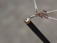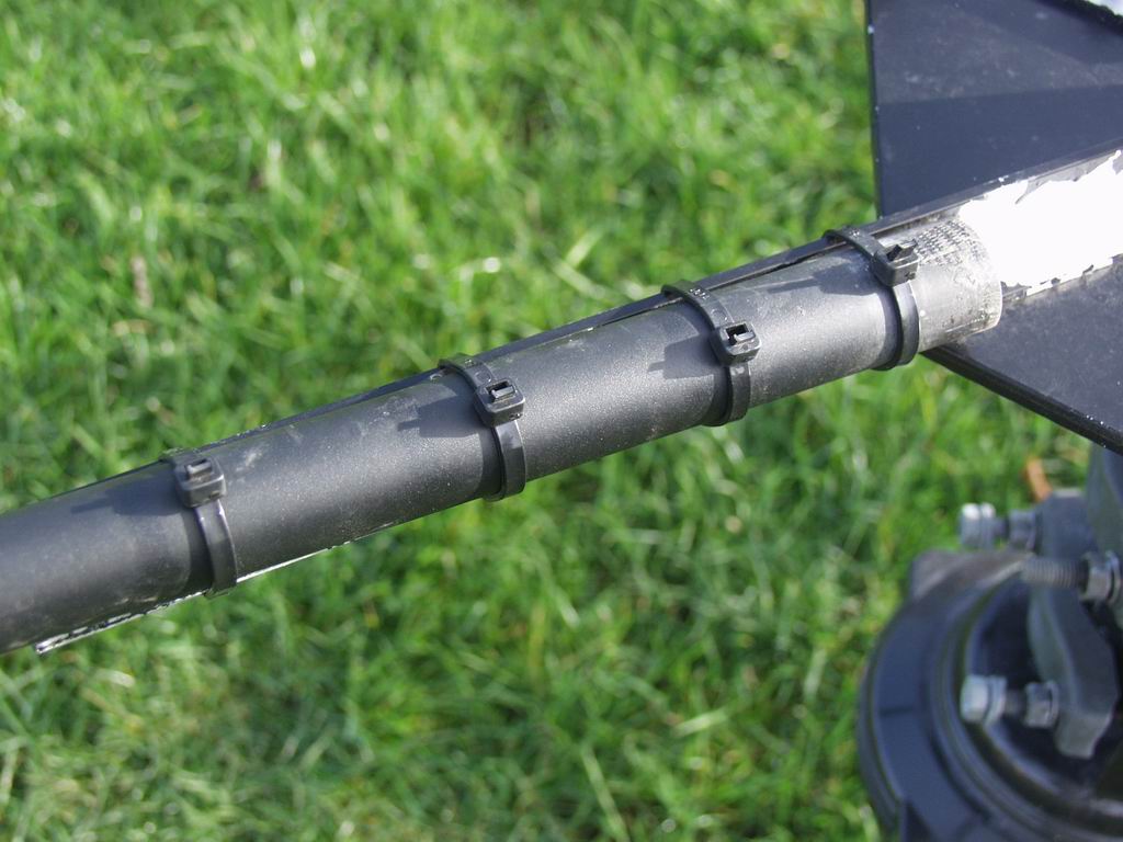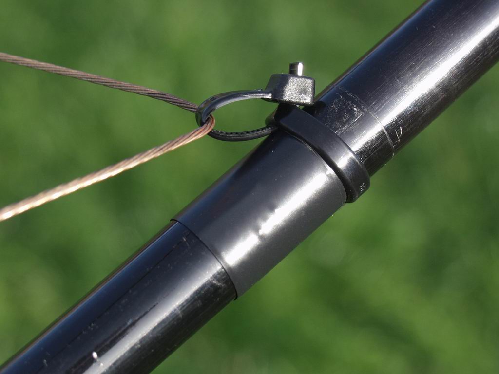 The spreaders are low-cost, 15ft fibreglass fishing poles with the final section unused - it's too "whippy". I fix the poles to the aluminium angle with 4 tie-wraps. Amazingly the poles and their fixings survived when the Mk1 fell to ground from a height of 20ft!