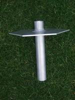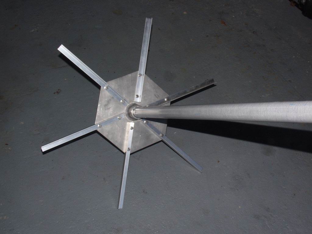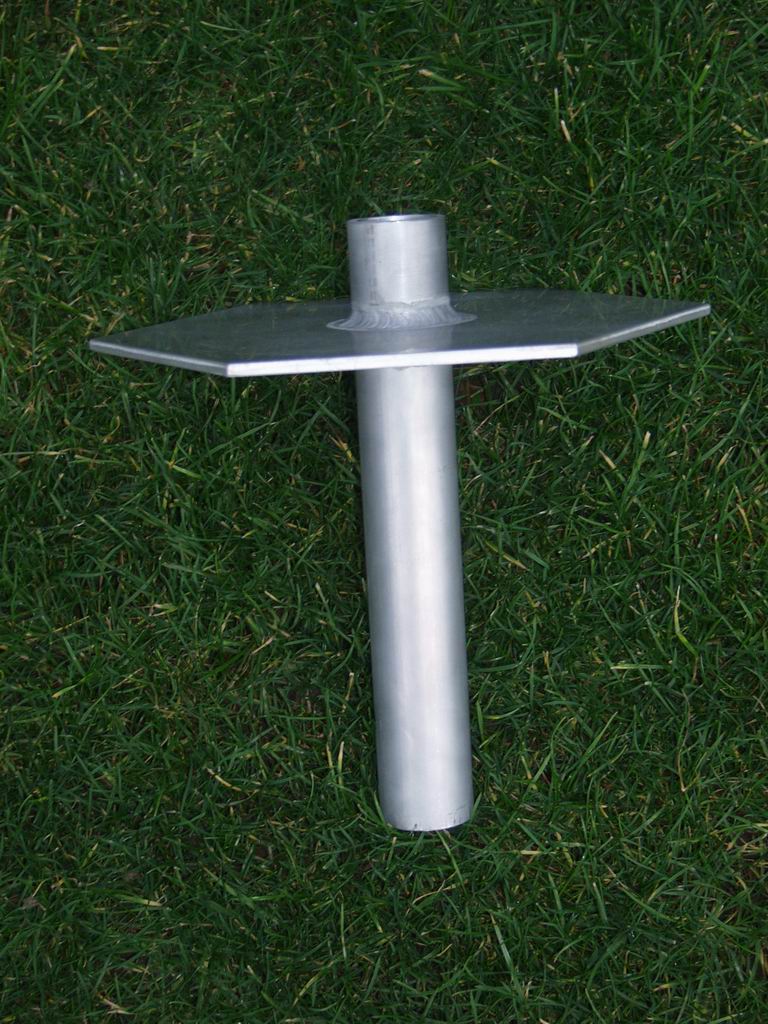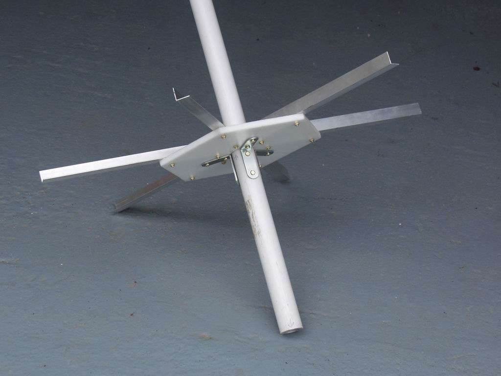 I was determined that the Mk2 would not suffer the same fate, so I had a local engineering firm make me up a 1/4" aluminium baseplate welded to a thick-wall aluminium pipe. I used a fibreglass centre post instead of the original PVC one, and thicker aluminium angle to support the spreaders. The angle was fixed to the baseplate with stainless nuts and bolts.