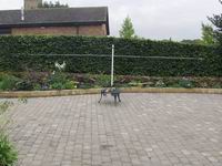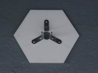 These two photographs show the original baseplate and centre post arrangement. The baseplate was made from a plastic kitchen chopping board and the centre post was cut from a length of PVC pipe. They were fixed together with 3 angle brackets; it was this mounting arrangement which failed in the strong winds. I've no doubt that the choice of materials would have been fine if had I joined them more securely.