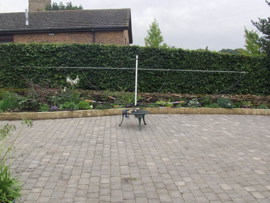 I strongly recommend that you adopt K4KIO's idea of pulling the structure into shape by cutting 12 equal length nylon cords and stringing them between centre post and spreaders - that way it will automatically take up the perfect hexagon shape. Here's a picture of mine at that stage, before loading the wires.