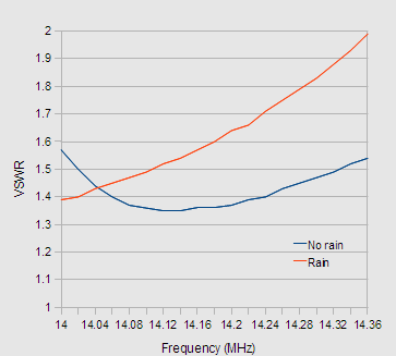 From time to time, Hexbeam users report that their VSWR appears to rise after a period of rain. I have not noticed the effect myself (despite living in UK!) and had not given the matter much thought until Leo K4KIO pointed me in the direction of an Antennex article written by YU1AW in which he attempted to model the effects of rain on VHF antennas. YU1AW assumed that the water would behave as a uniform dielectric surrounding the antenna conductors, and he modelled the effect the dielectric would produce on antenna performance. Although some of YU1AW's assumed dielectric parameters for the rain are open to challenge, the underlying principles might well explain the observed shifts in Hexbeam VSWR.